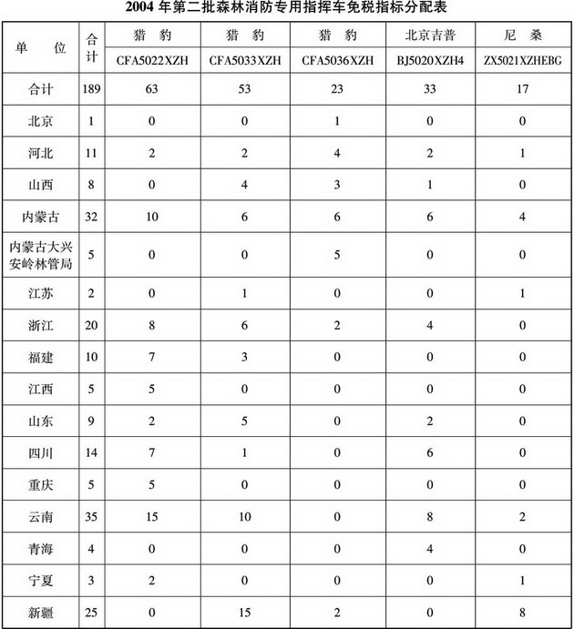 各省、自治区、直辖市、计划单列市财政厅(局)、国家税务局,新疆生产建设兵团财务局: 根据《财政部、国家税务总局关于防汛专用等车辆免征车辆购置税的通知》(财税〔2001〕39号)第一条的规定,对国家林业局申请的2004年第二批189辆设有固定装置的森林消防专用指挥车免征车辆购置税(具体免税范围见附件1),免税指标的使用截止期限为2005年6月30日,过期作废。 车主在办理车辆购置税纳税申报手续时,需向所在地国家税务局车购办提供车辆内观、外观彩色5寸照片1套,国家林业局森林防火办公室配发的“森林消防专用车证”和“森林消防车辆调拨分配通知单”(两证单式样见附件2)。国家税务局车购办依据本通知所附的免税车辆计划、免税车辆型号、车辆内观、外观彩色照片、“森林消防专用车证”、“森林消防车辆调拨分配通知单”(照片及证单式样从国家税务总局FTP服务器的LOCAL流转税司消费税处森林消防专用指挥车免税图册地址下载)为车主办理免税手续。 免税车辆因转让、改变用途等原因不再属于免税范围的,应按照《中华人民共和国车辆购置税暂行条例》第十五条的规定补缴车辆购置税。 国家林业局应在2005年12月31日前将2004年实际免税车辆的使用单位、型号、数量及免税额等情况以书面形式送财政部、国家税务总局。 附件:1.2004年第二批森林消防专用指挥车免税指标分配表 2.森林消防专用车证和森林消防车辆调拨分配单式样(编者略) 附件1: